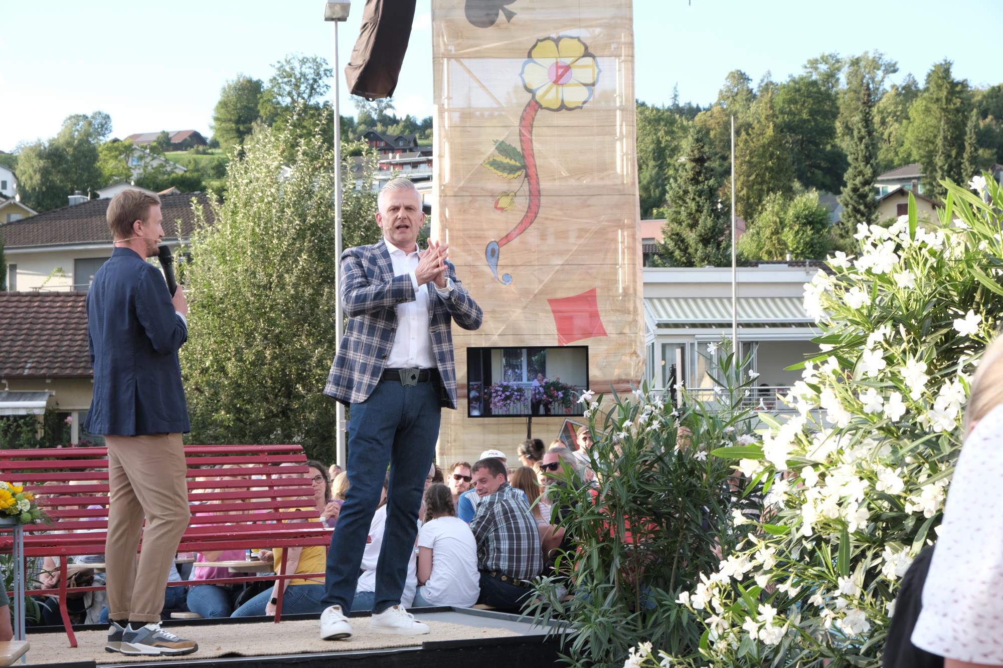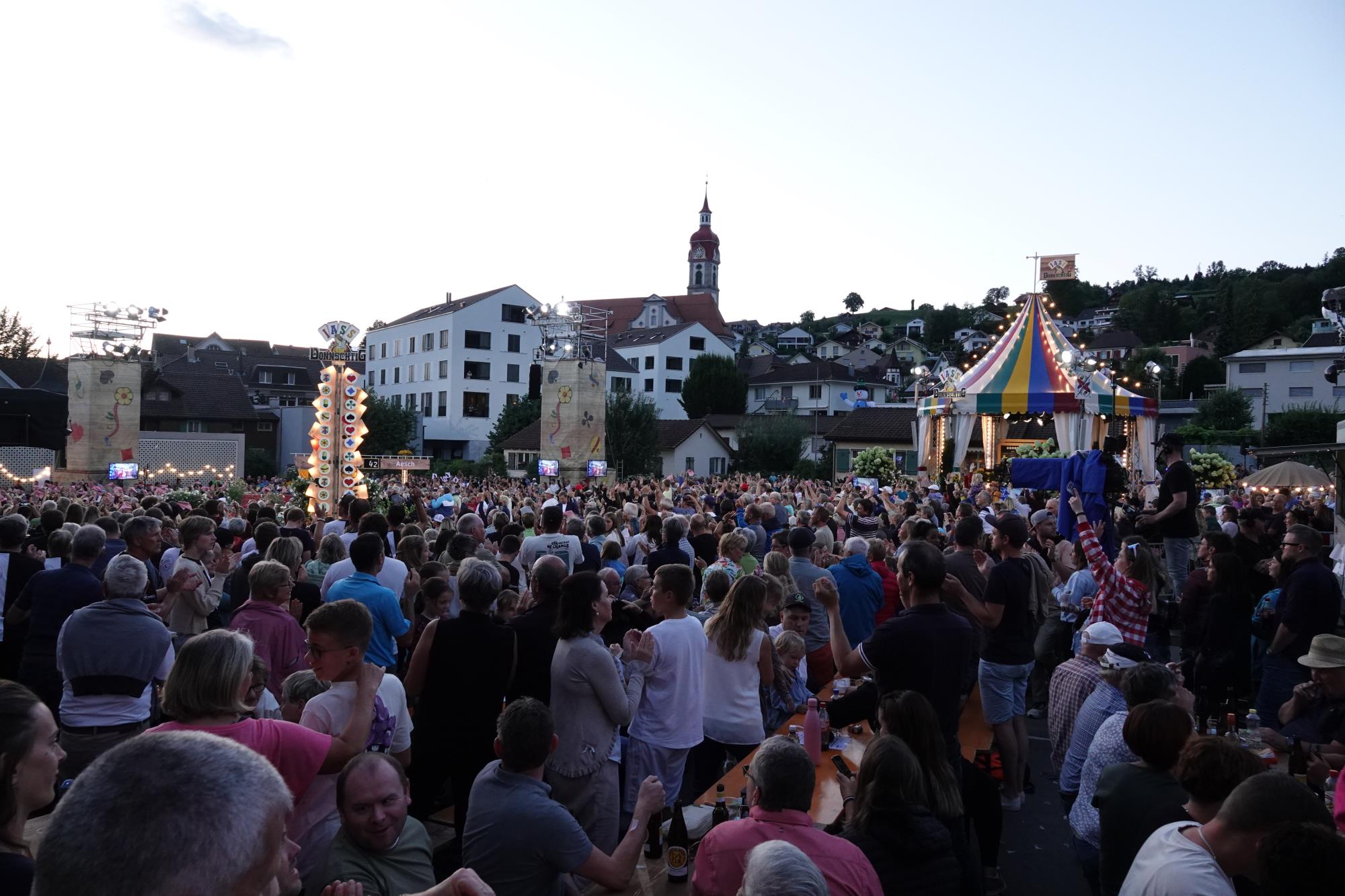 Der Donnschtig-Jass fand in Ruswil vor unglaublichen 5000 Leuten statt. Der Märtzplatz schien aus allen Nähten zu platzen. Das Schweizer Fernsehen arbeitete in den Menschenmassen seelenruhig. Moderator Rainer Maria Salzgeber und Comedian Stefan Büsser waren gut drauf und führten mit viel Humor durch die Sendung. Stargast war die Sängerin, Tänzerin und Musical-Darstellerin Fabienne Louves. Für Super-Stimmung sorgten die beiden Musik-Acts: Kunz und Stubete Gäng rissen das Volk von den Bänken.
