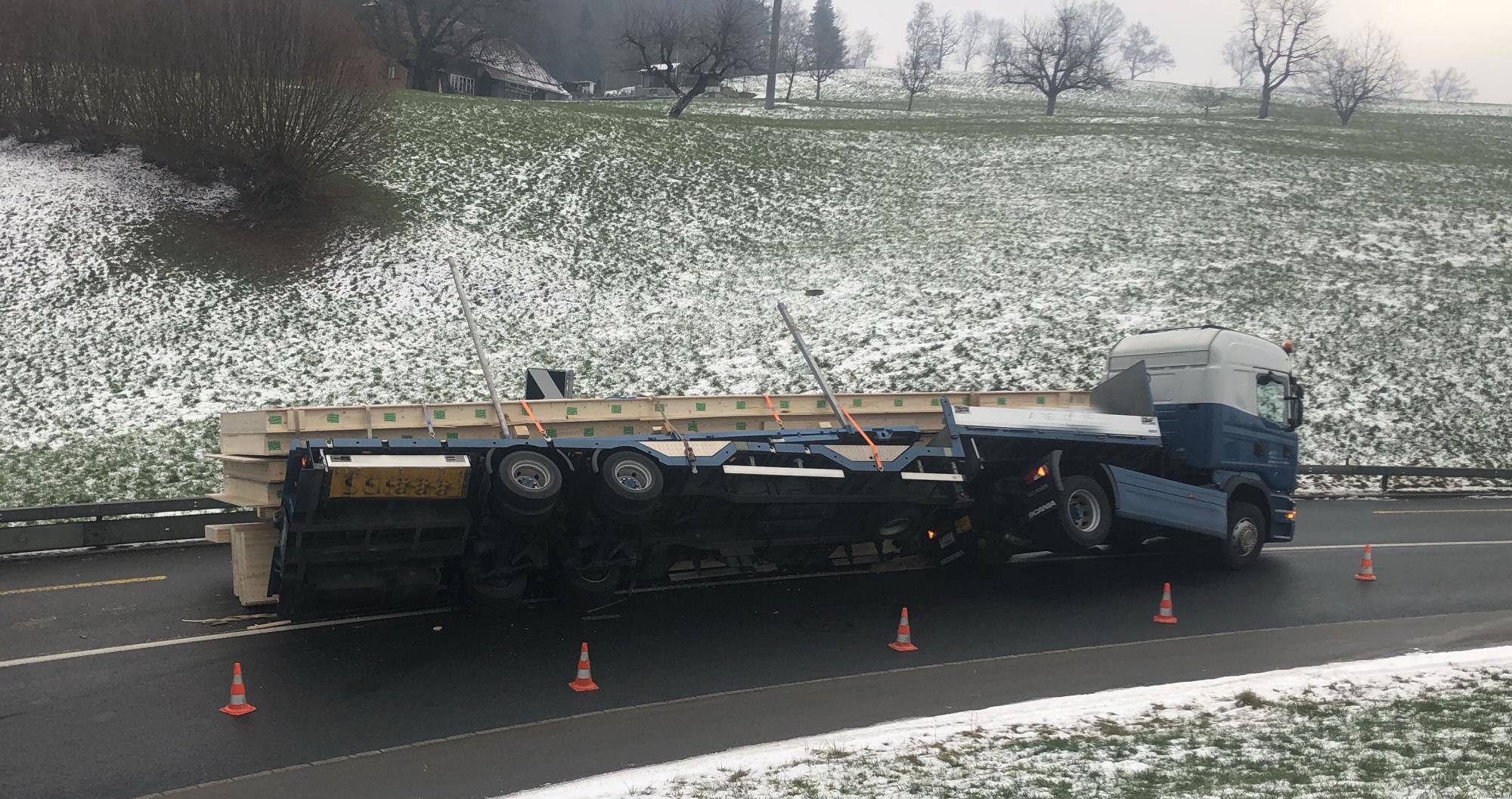 Unfall Am Montagvormittag kippte im Schwanderholzstutz ein Sachentransportanhänger. Verletzt wurde niemand. Die Strasse musste vorübergehend gesperrt werden.
