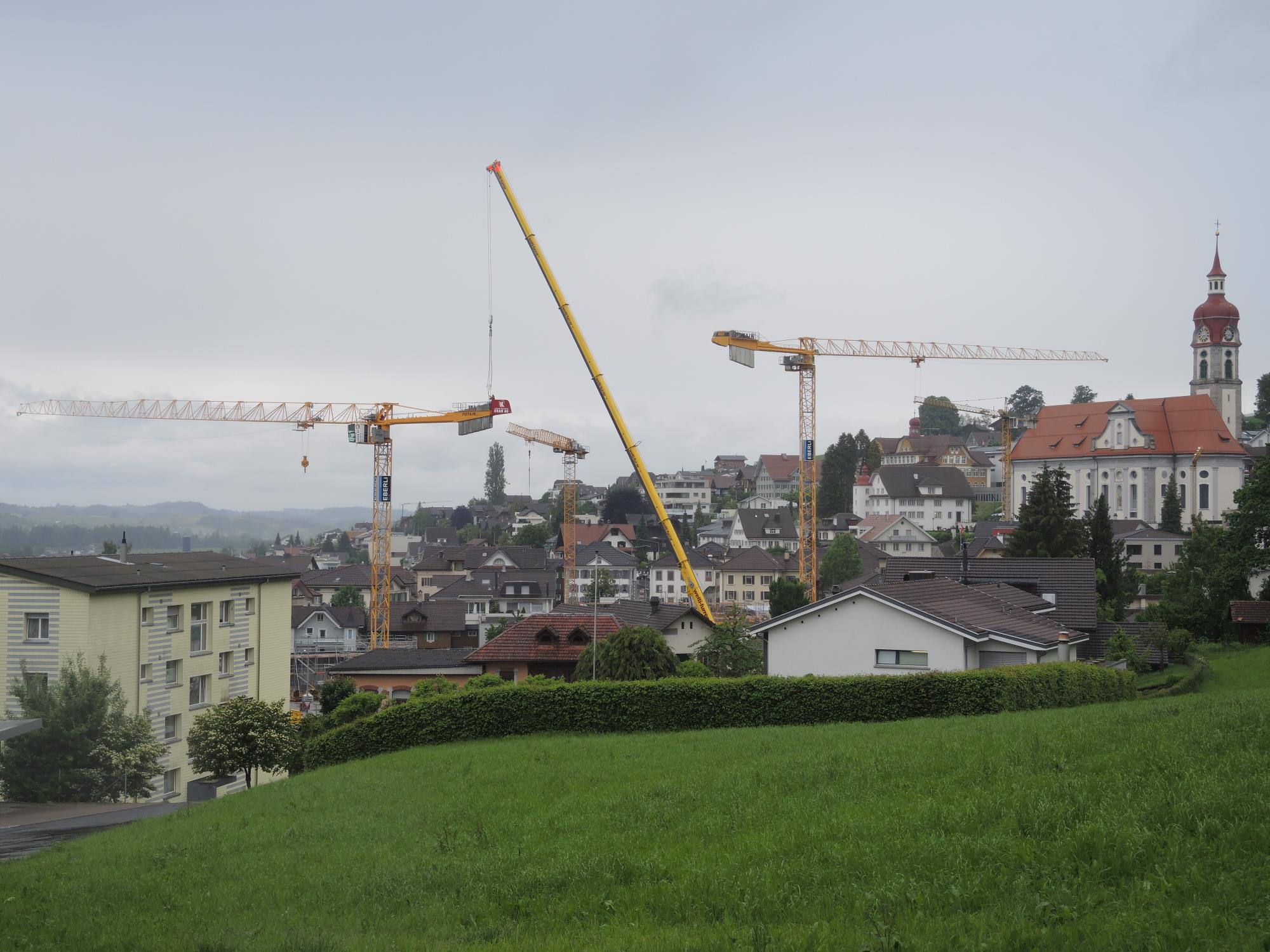 Kräne Heute Mittwoch (12. Juni) begann mit dem Abbau des grössten Krans auf dem Märtplatz die Schlussphase beim Bau des unterirdischen Parkhauses.